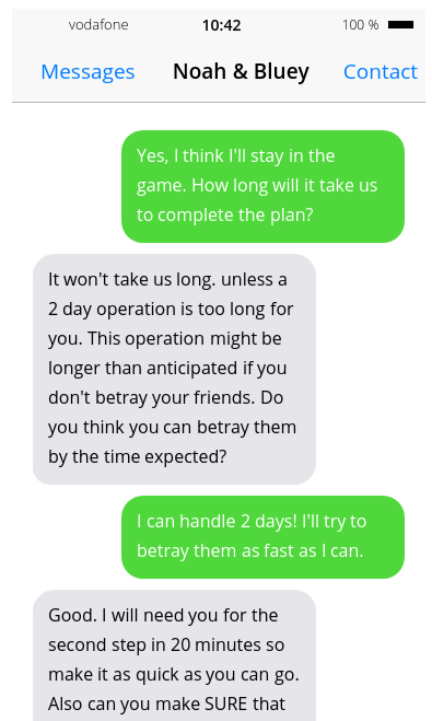 This week for writing we had to write a play for other groups to perform. For our play we are now writing down the dialogue. Dialogue is a conversation between two or more people in a movie, book, play and more. We had to write down a dialogue for our play in the form of text messages. We had to use two of our characters from our play. We had to write at least 4+ text message pages.